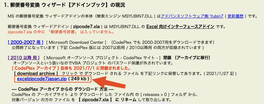 excelzipcode7japan.zip ( 249 kb )がダウンロードできれば完了です
