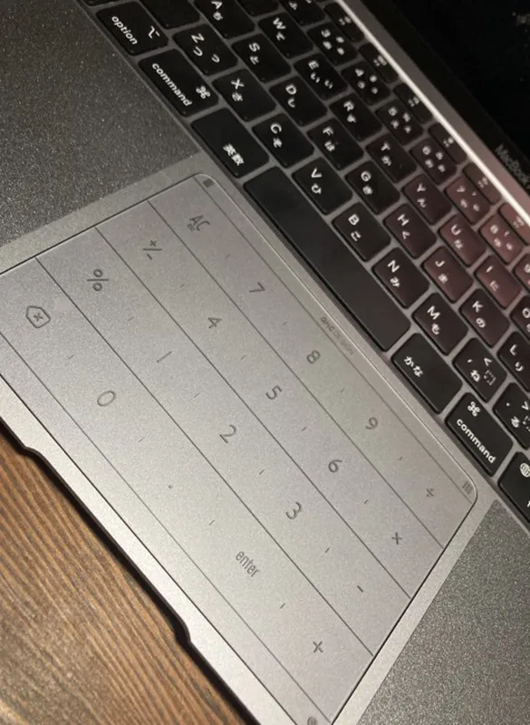 トラックパットに数字が書かれたカバーを貼り、Numsのアプリをインストールすることでトラックパッドがテンキーとして使えるようになります。