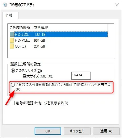 そんな方は、ごみ箱の設定でファイルを移動した瞬間に削除されるようになっている場合があります。