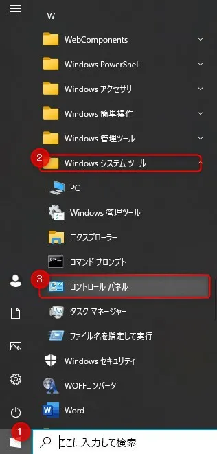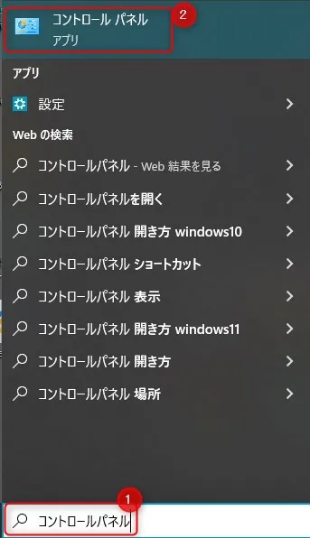 検索からコントロールパネルと検索して開くか、スタートボタンからWindowsシステムツール→コントロールパネルを開きます。