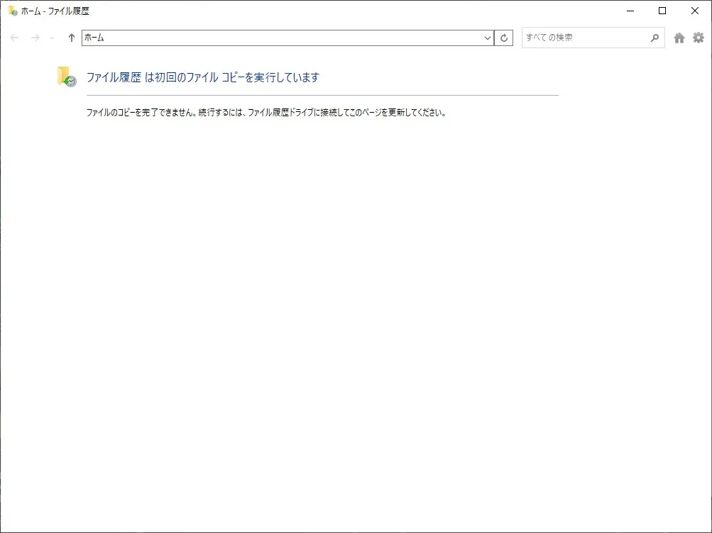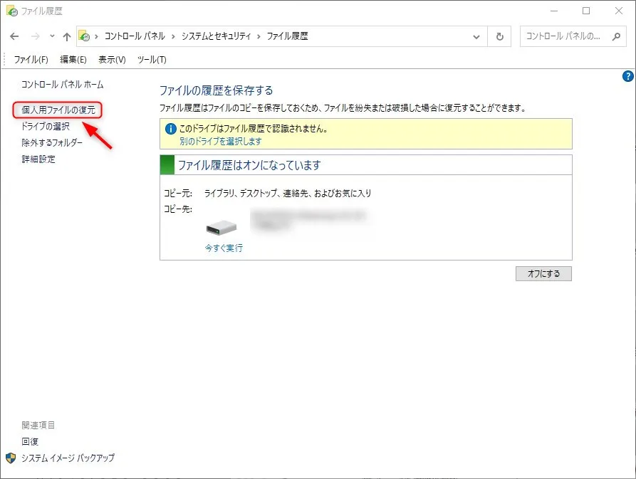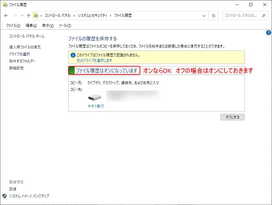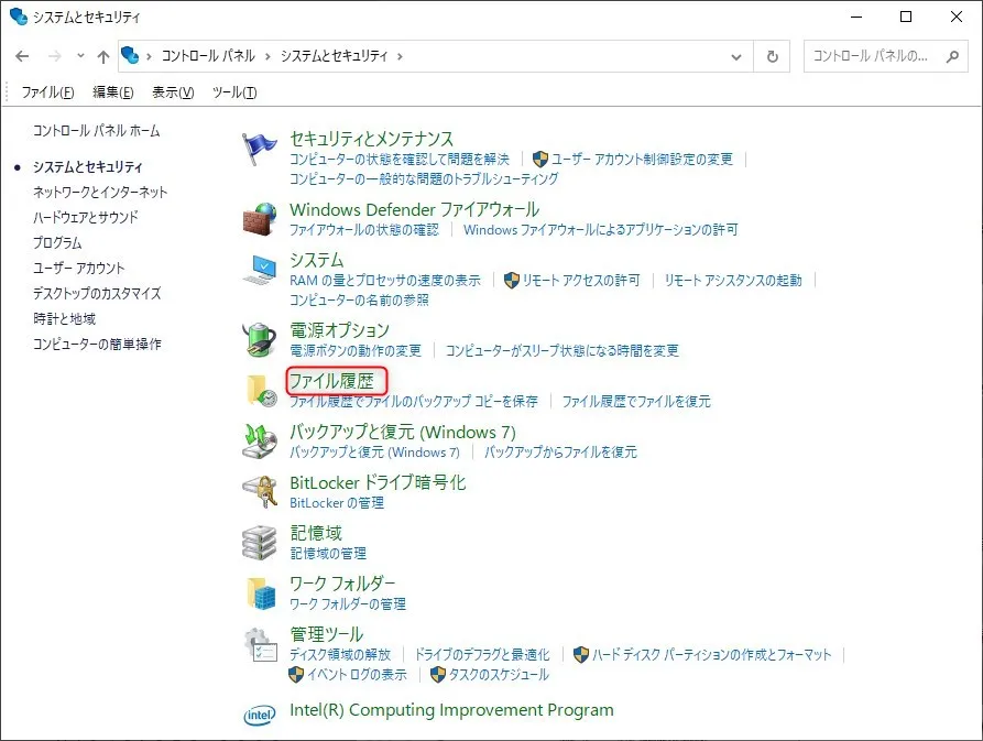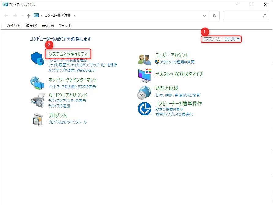 コントロールパネルの表示方法をカテゴリにし、システムとセキュリティからファイル履歴を開きます