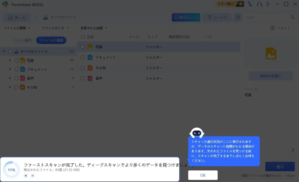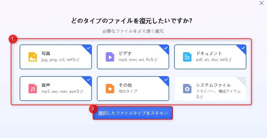 復元したいファイルの形式が決まっている場合は、それのみ選択することで復元時間を短縮することができます。
