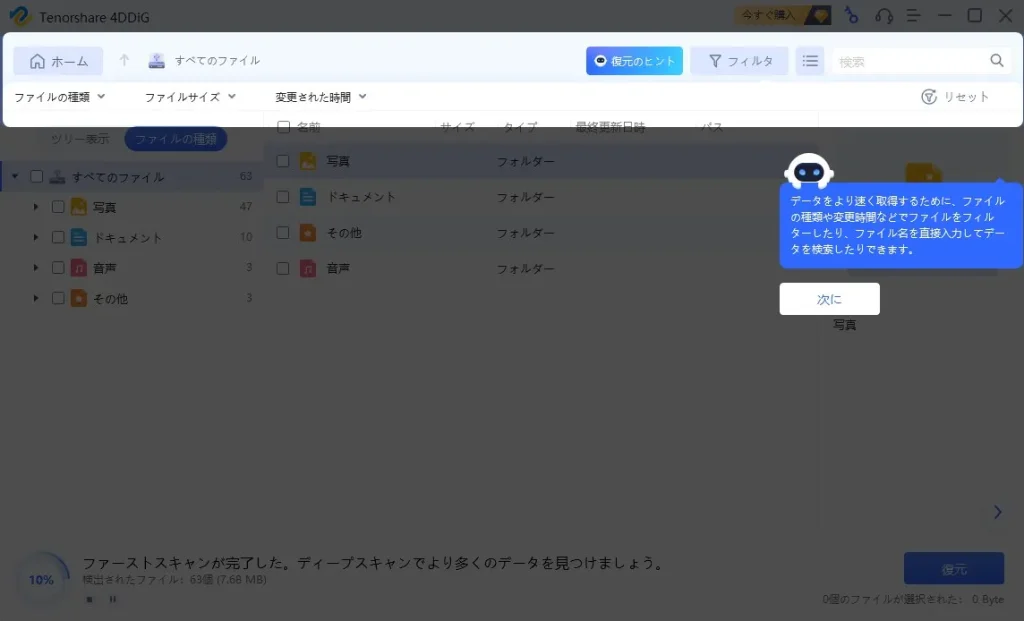 ファイルの種類や更新時間などでフィルタをかけると、より早くデータを復元することができます
