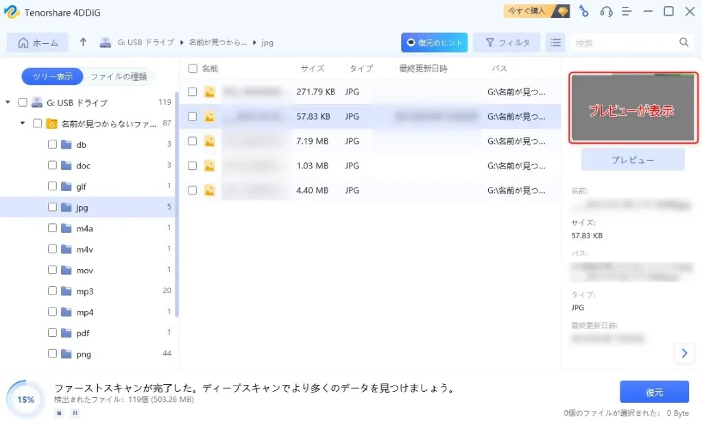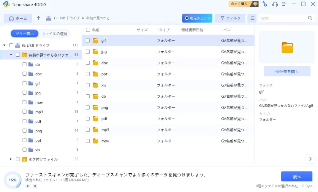 今回の4DDiGのデータ復元ソフトを使用して、あらかじめデータを入れて削除したUSBメモリを復元しました。すると