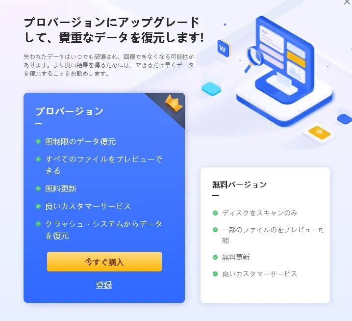 4DDiGは無料でスキャンを行う事ができるため、購入前に目当てのファイルが復元できるかを確認してから登録するとベストです
