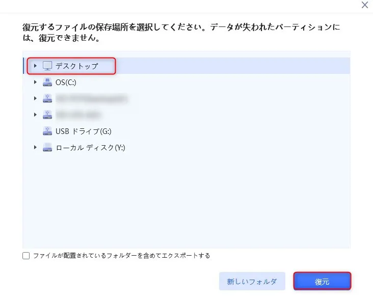 製品版に登録後、復元したいデータにチェックをいれて復元ボタンを押すと、保存先を選択することができます。